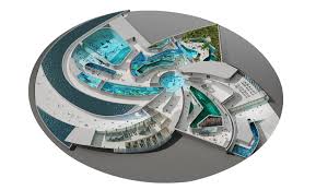 水族館內的走道和展覽的水族箱也都是依漩渦形狀建設 , 所以是凹面的櫥窗 .
